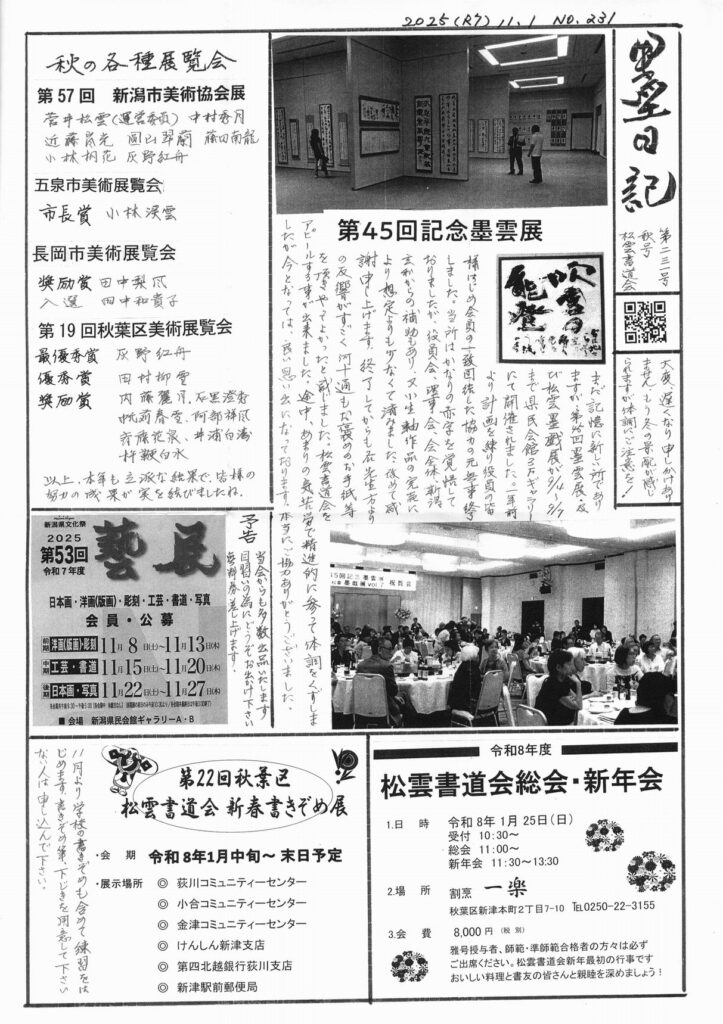 皆様のご協力により盛会のうちに終了いたしました「第45回記念・墨雲展」への、松雲書道会 菅井会長からの御礼のご挨拶を巻頭に掲載しております。