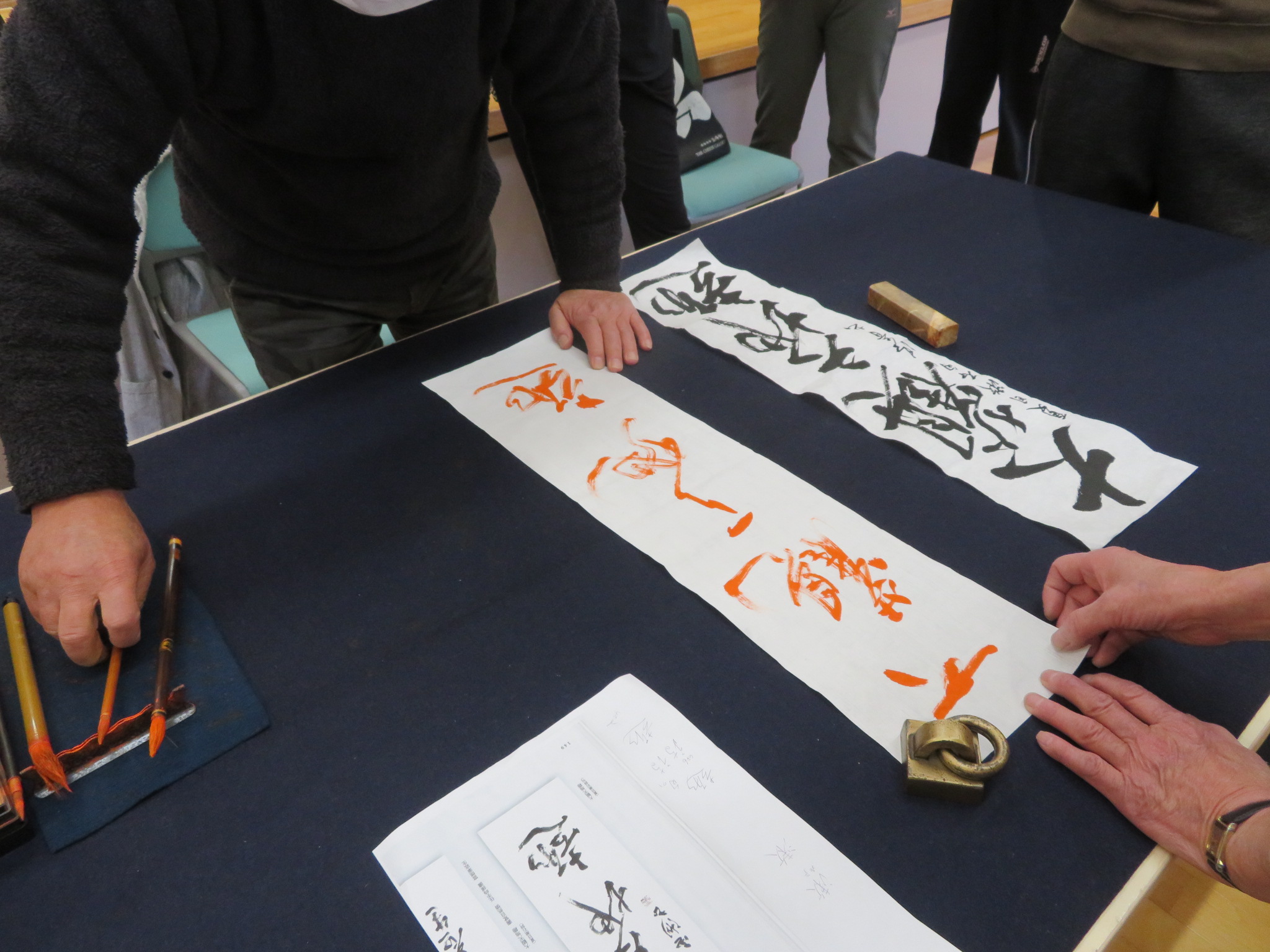 参加者はそれぞれ事前に用意した書花展課題の草稿を中央に並べ、菅井会長による丁寧な批評をいただきました。その場で会長に朱書きのお手本を直接書いていただく貴重な機会を経て、各自熱心に錬成に入りました。最後は、再び菅井会長による個別作品添削が行われ、一人ひとりの課題と完成度が高まる、あっという間の一日となりました。