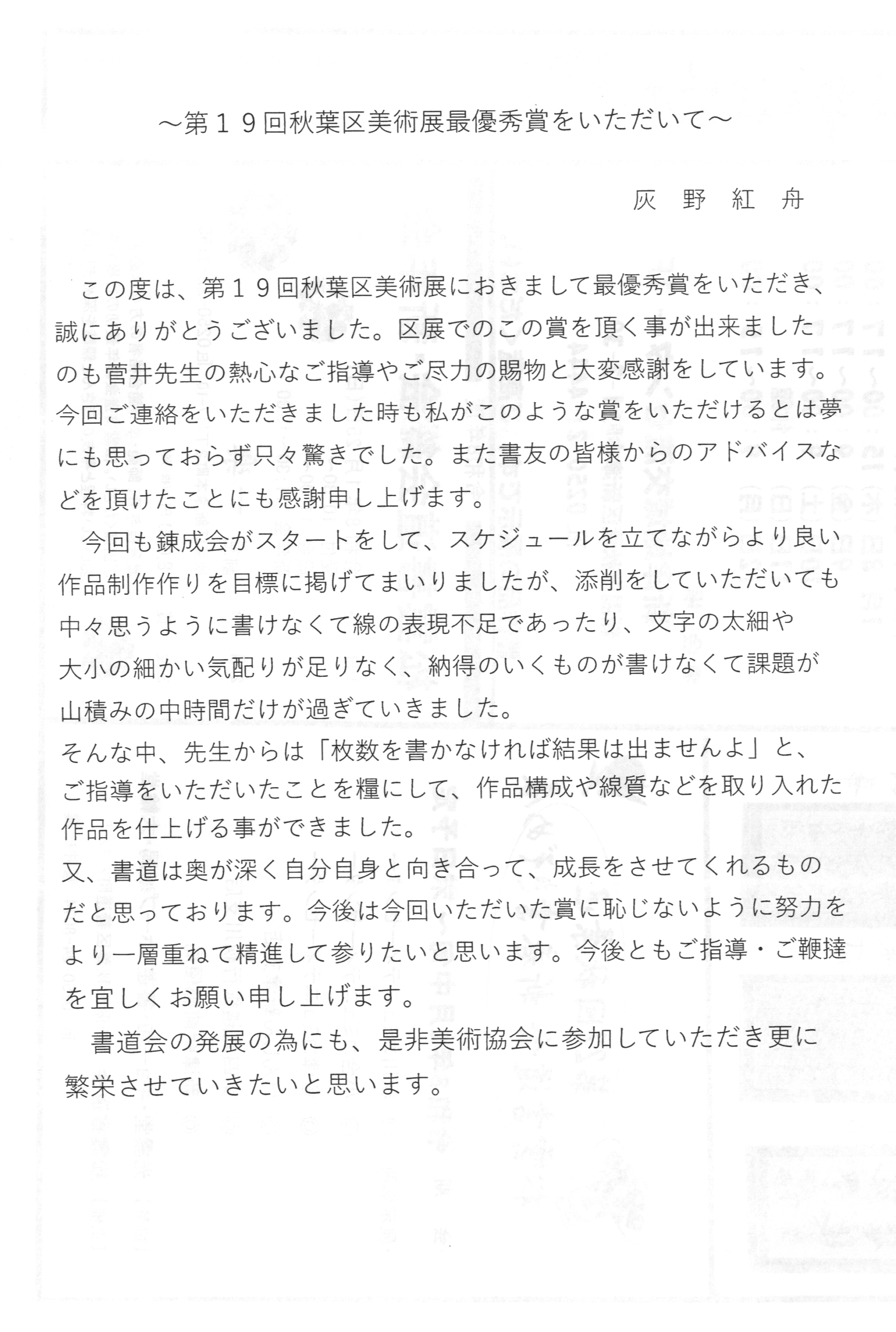 ・灰野 紅舟さん:『第19回秋葉区美術展』にて「最優秀賞」受賞