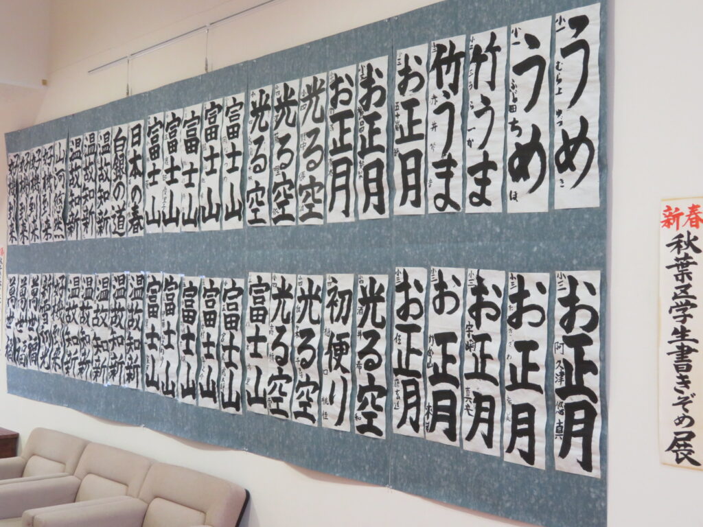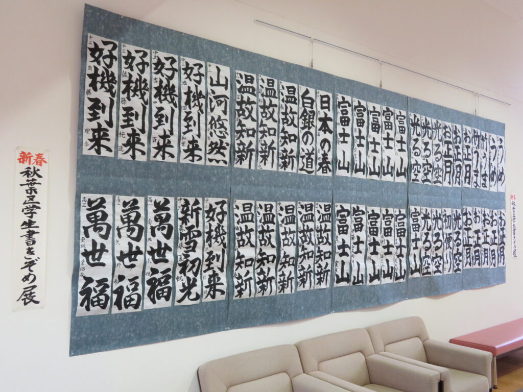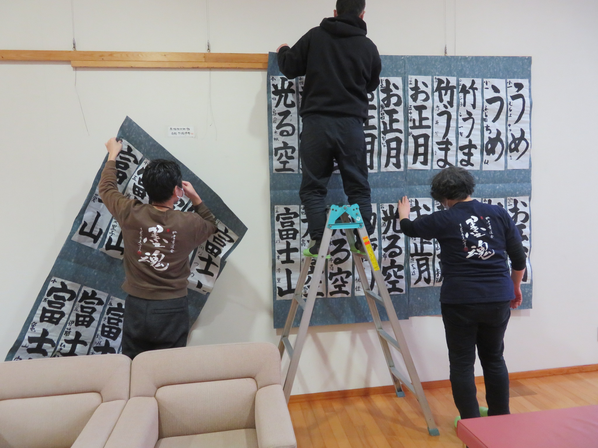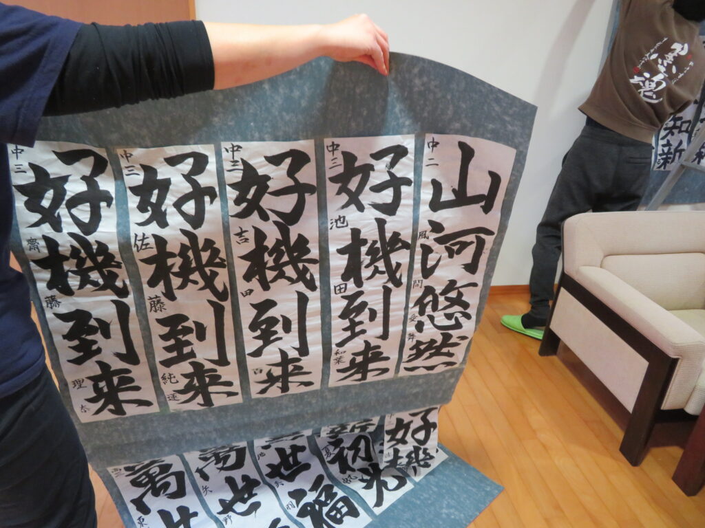 錬成会の冒頭では、1月中旬より秋葉区内で開催される「第22回松雲書道会 新春書きぞめ展」の設営準備を行いました。学生たちの力作を一枚一枚丁寧に貼り出し、展示の準備を整えました。