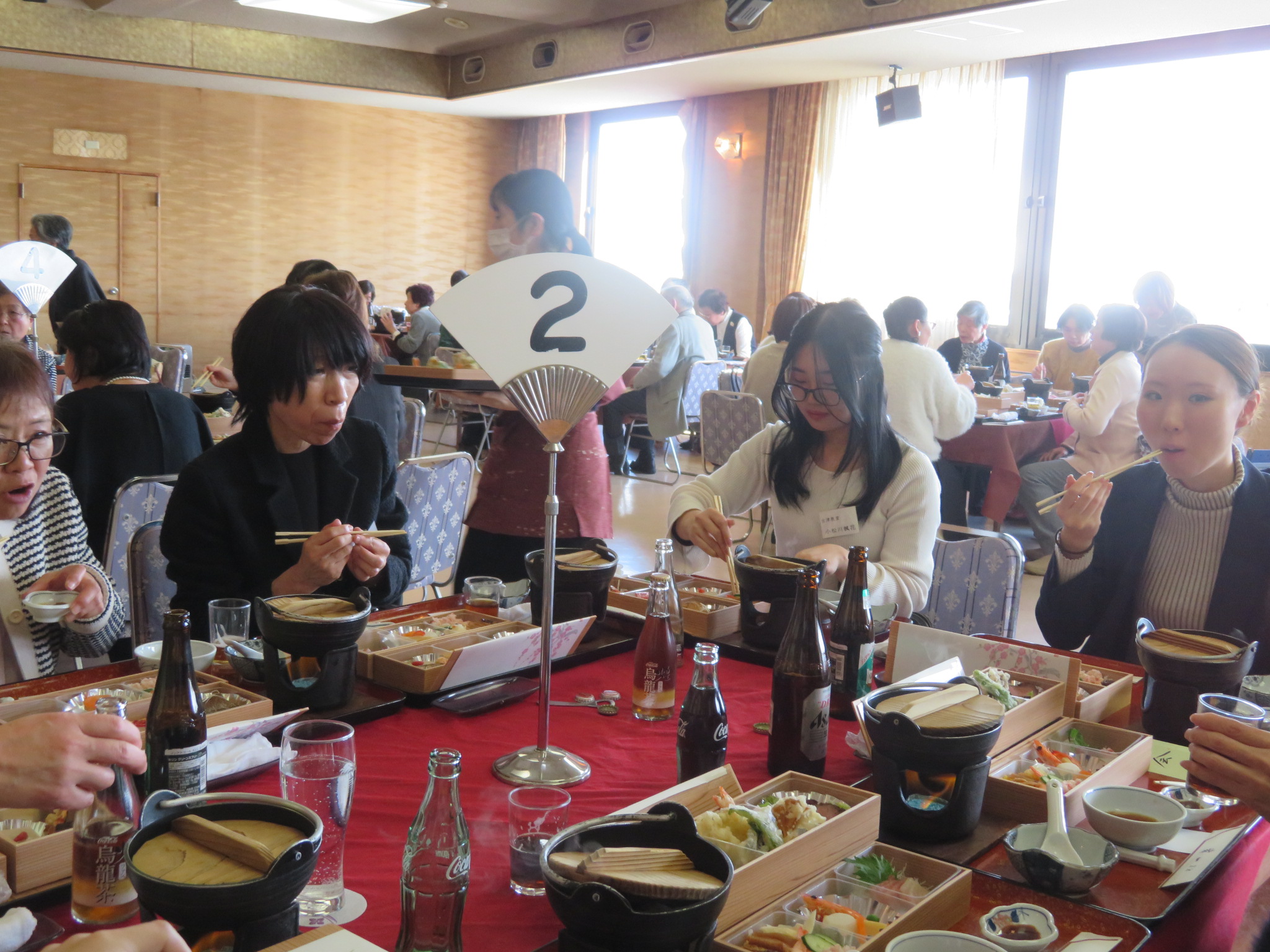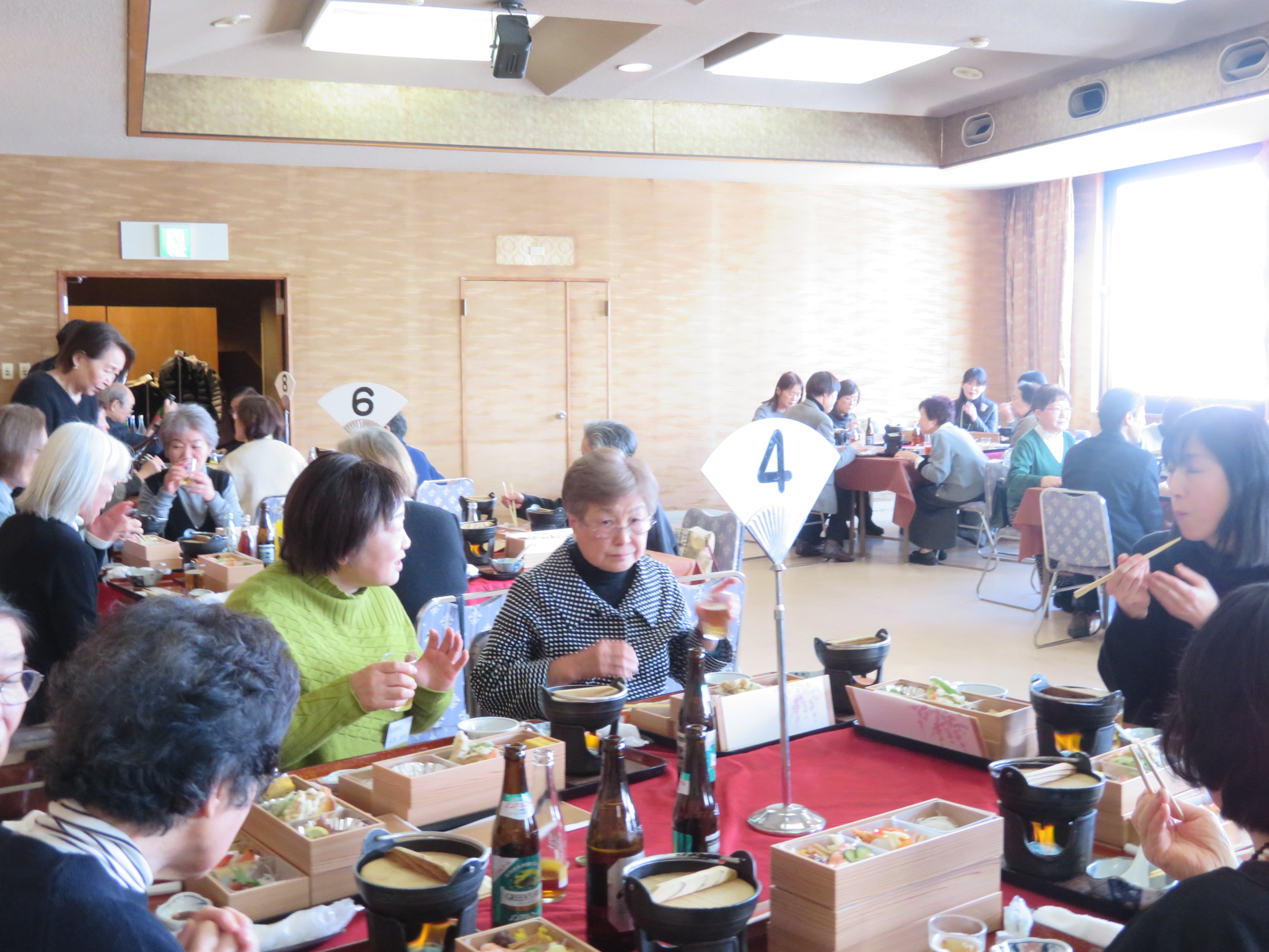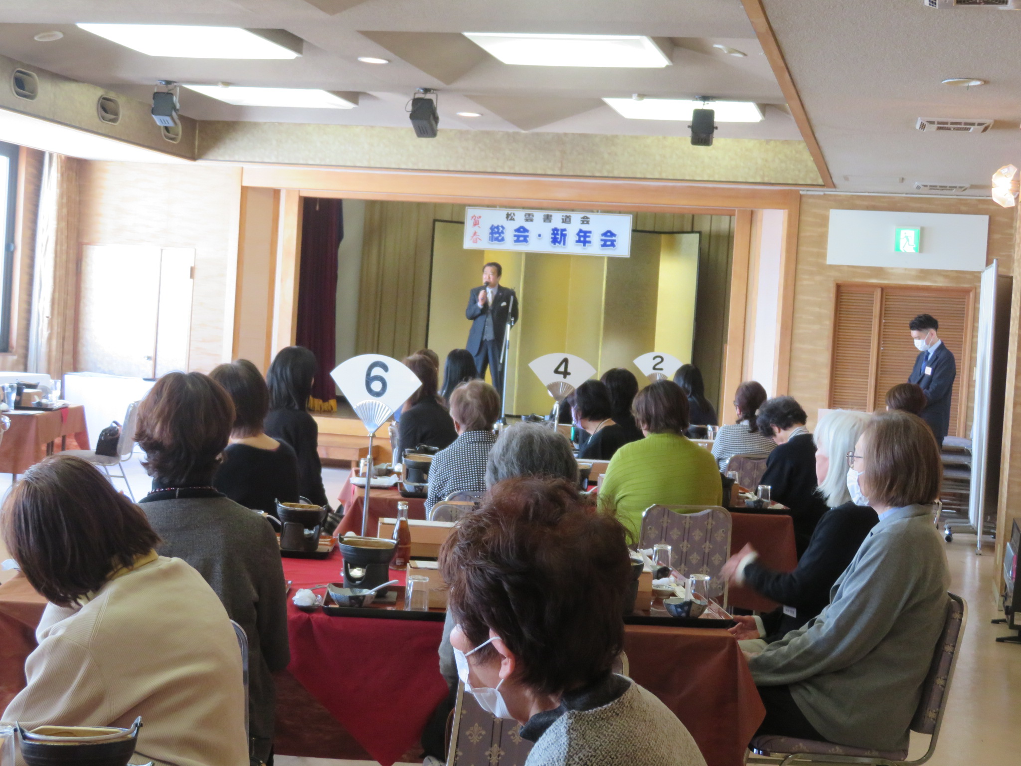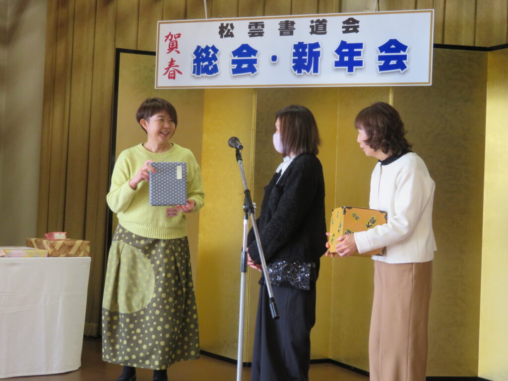 また、今年度は雅号授与(4名)、師範(1名)、準師範(1名)の昇格・合格授与式も執り行われ、会場は温かな祝福の拍手に包まれました。その後の懇親会では、美味しいお料理を囲みながら、恒例の福引大会などで大いに盛り上がり、会員同士の絆を深める華やかなひとときとなりました。