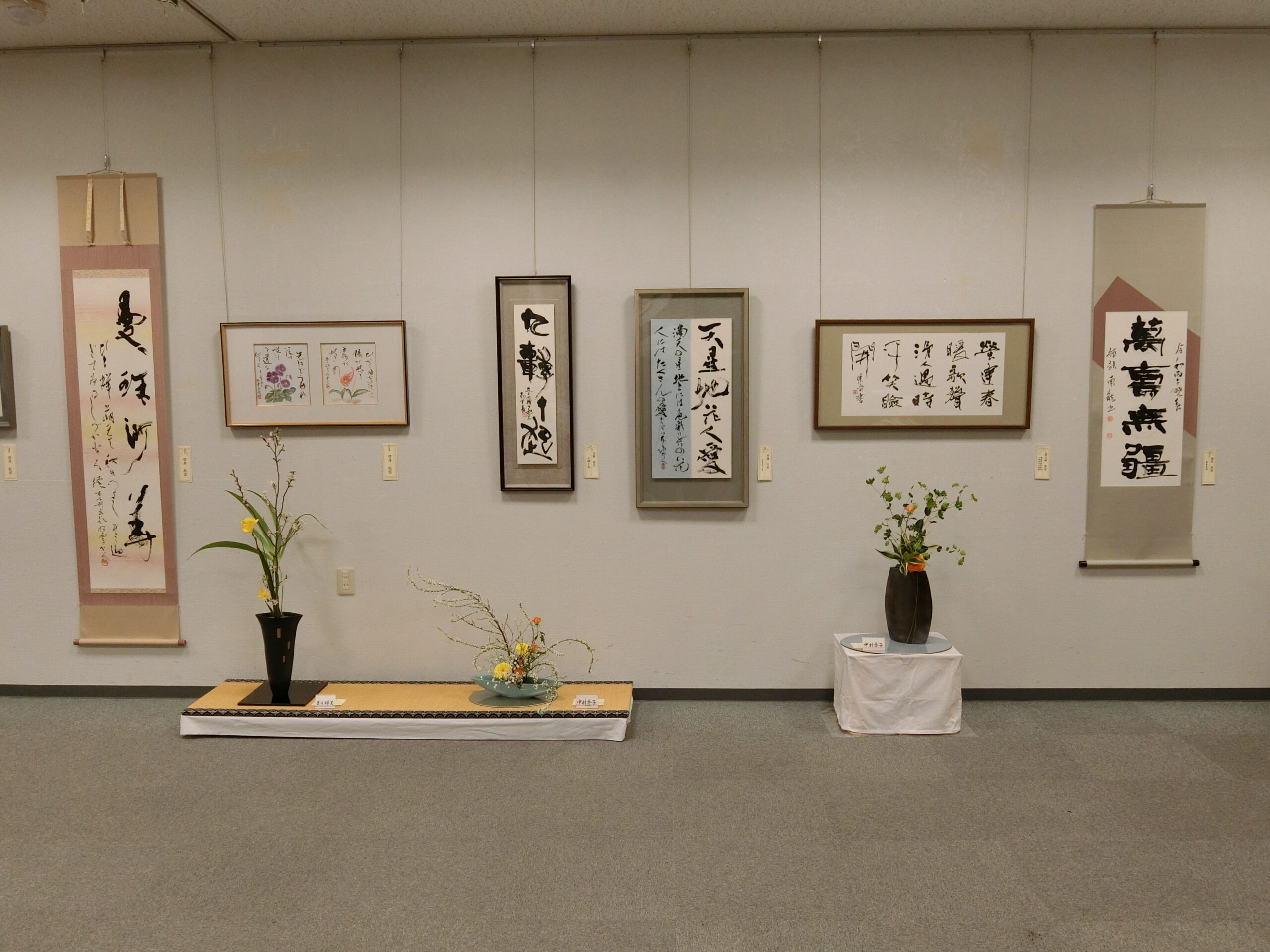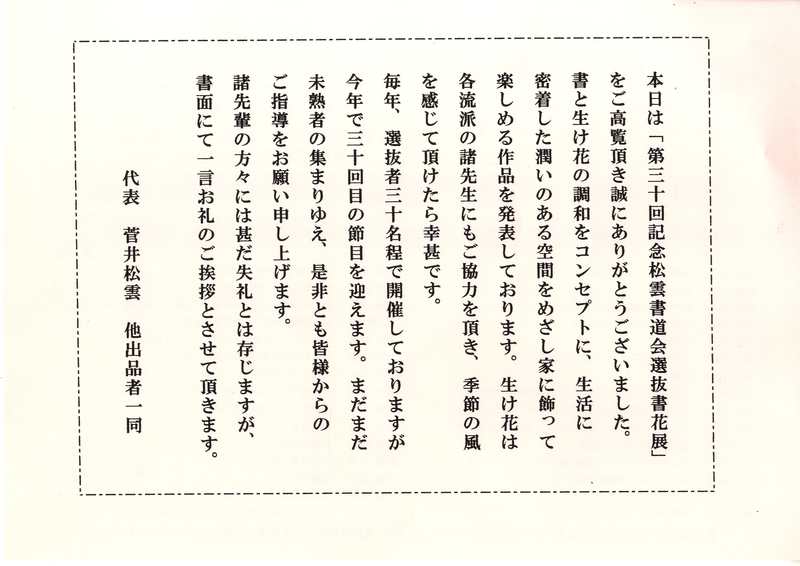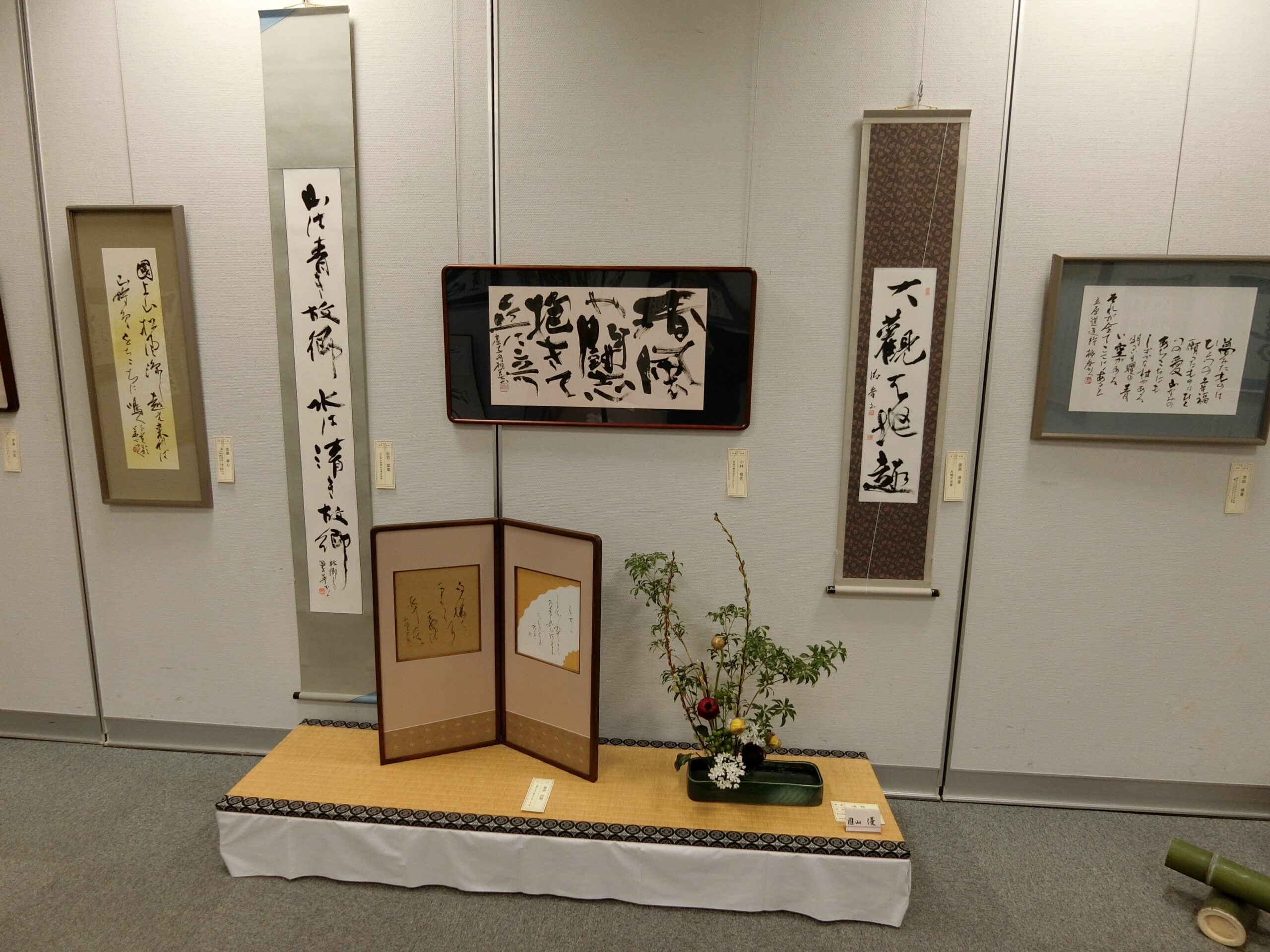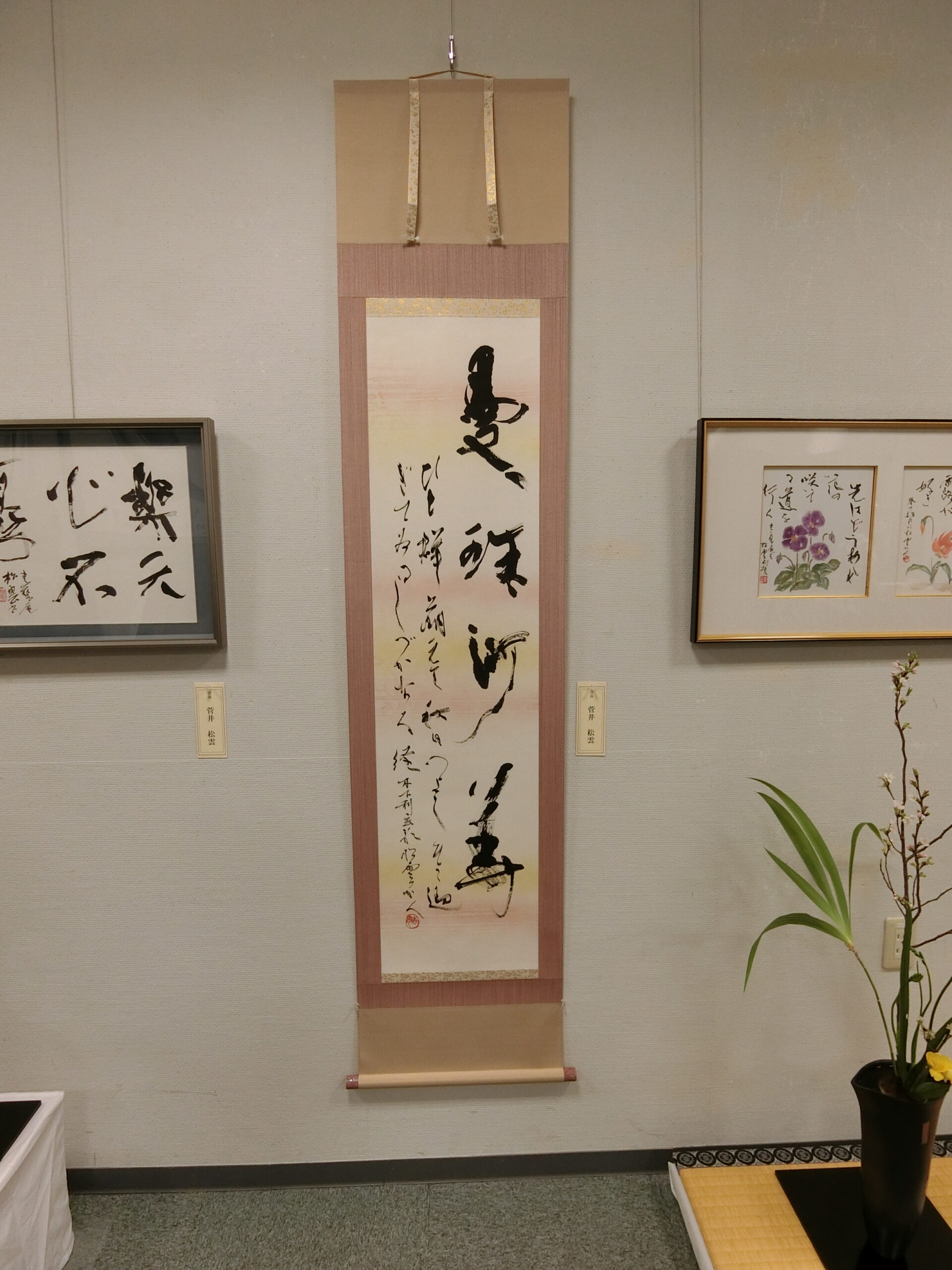 本展は、松雲書道会の菅井松雲会長、副会長をはじめとする選抜会員29名による渾身の書に、華道界の諸先生方による彩り豊かな生け花を添えた、書と花のコラボレーション展です。