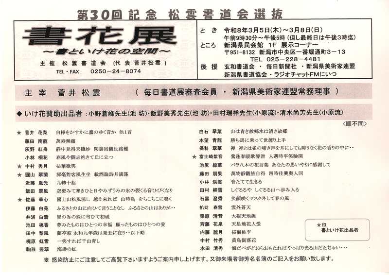 令和8年3月5日(木)から8日(日)までの4日間、新潟県民会館にて「第30回記念 松雲書道会選抜『書花展』」を開催いたしております。