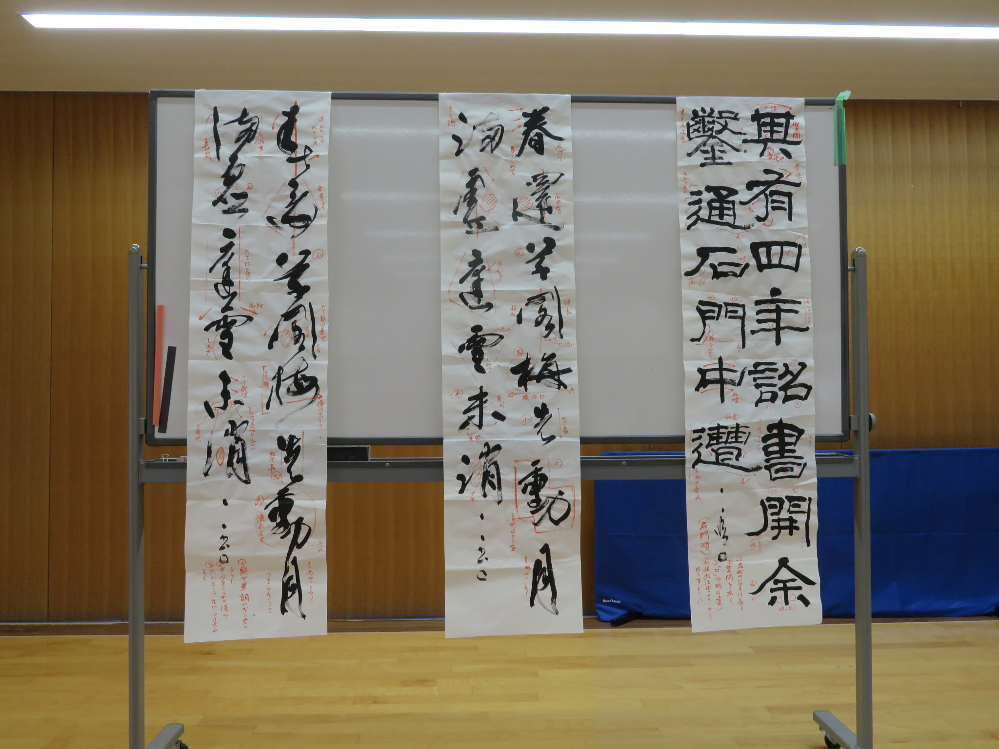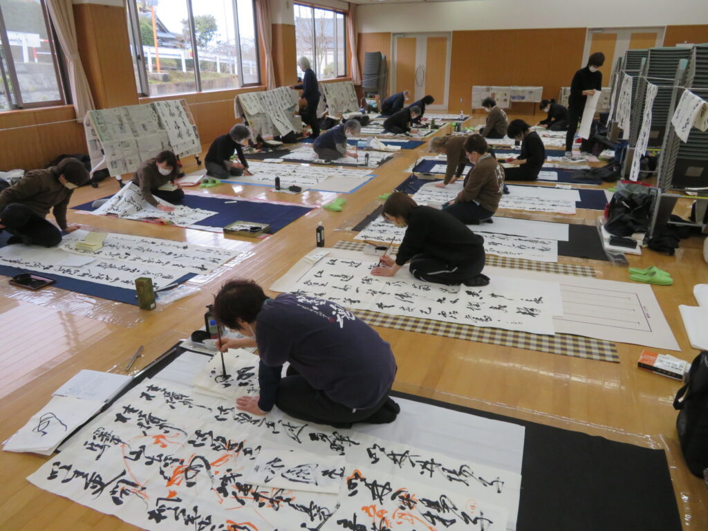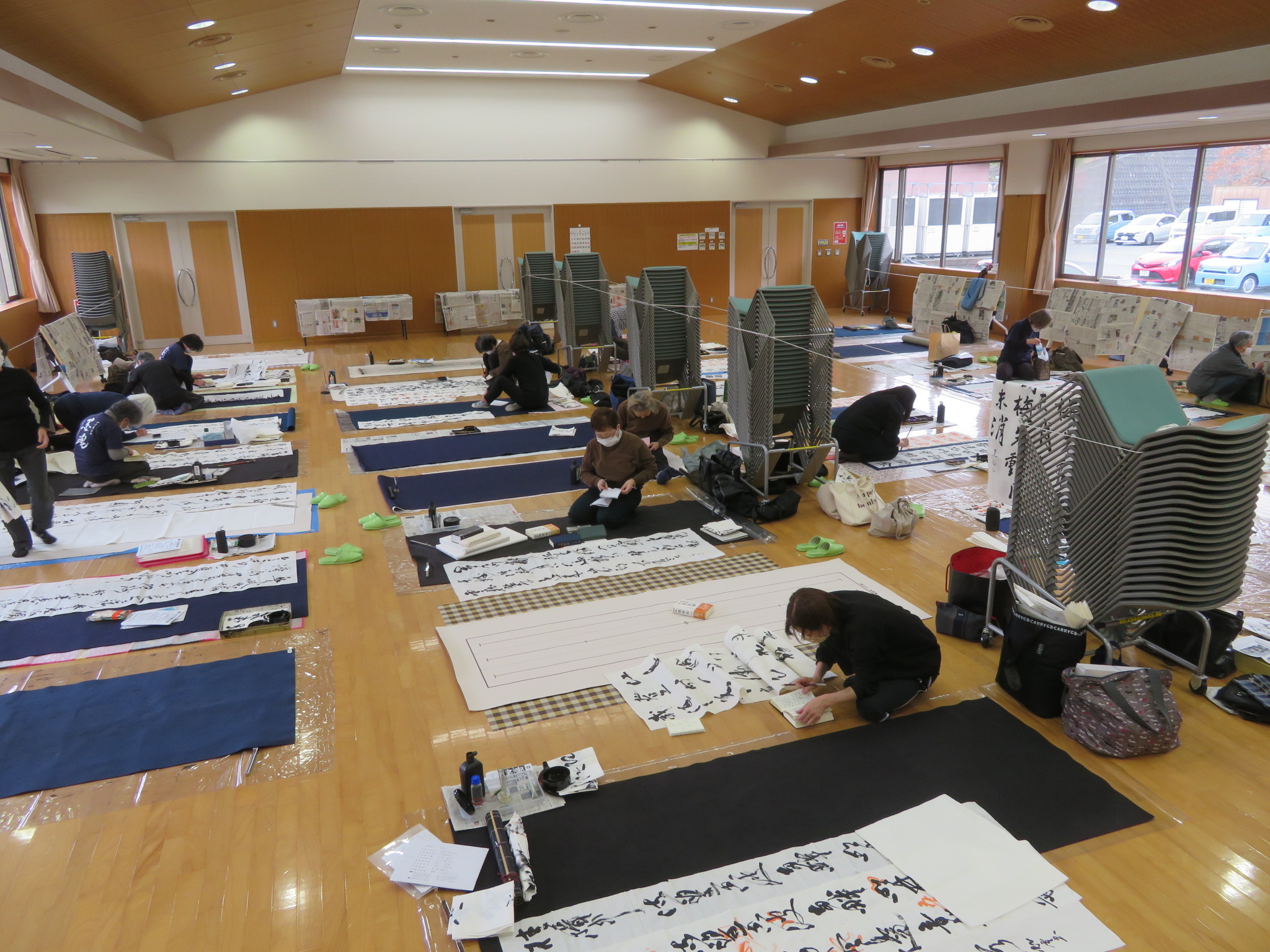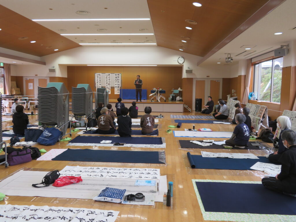 講義では、会長自ら筆を執り、昇段級課題のポイントを具体的に解説。お手本を食い入るように見つめる会員の皆様からは、一画一線を大切にしようとする熱意が伝わってきました。 広い会場で集中して大作に挑む時間は、日頃の稽古とはまた違った刺激となります。お互いの作品から学び、高め合った今回の錬成会。この経験が、皆様のさらなる飛躍につながることを期待しております。