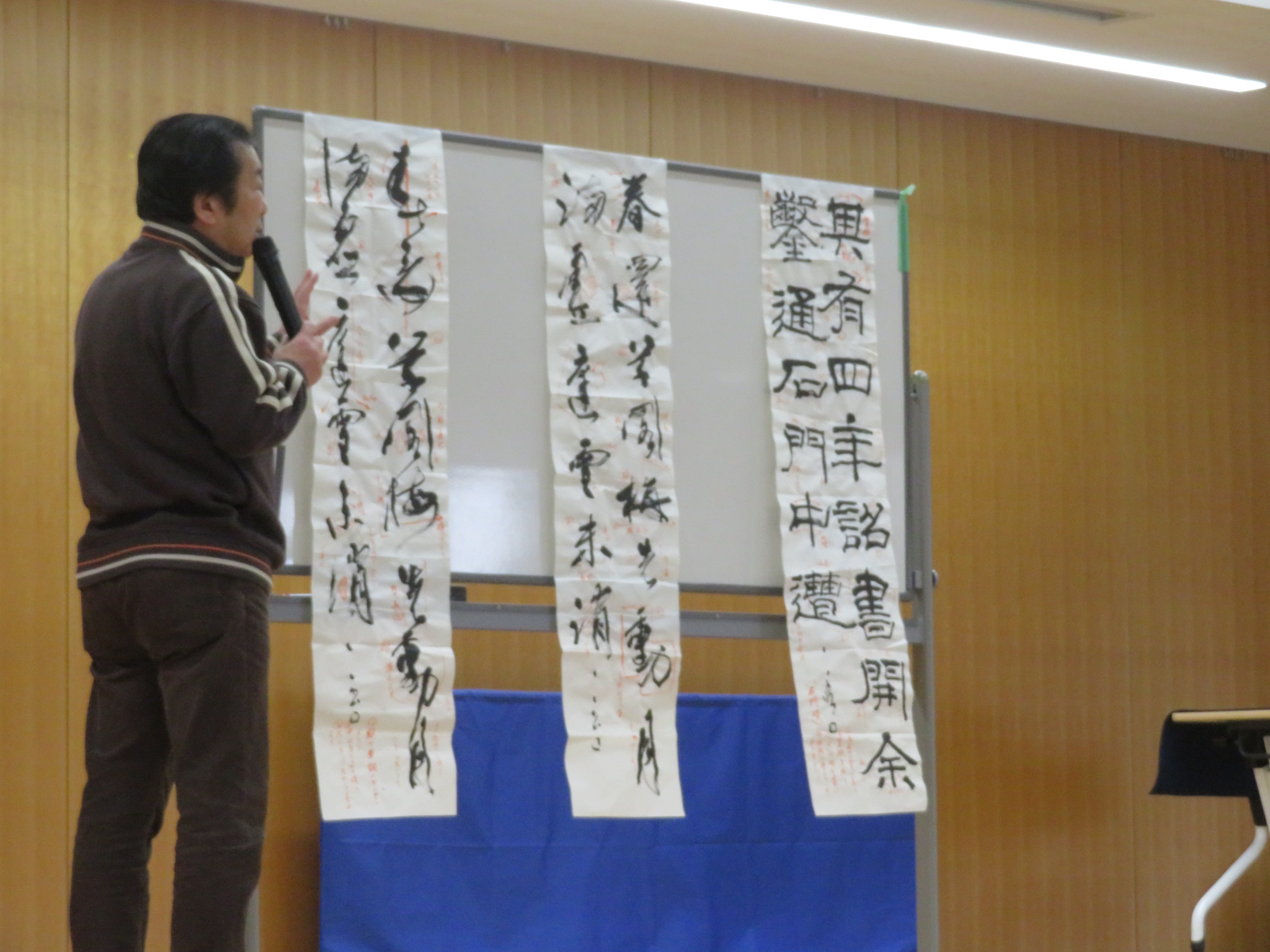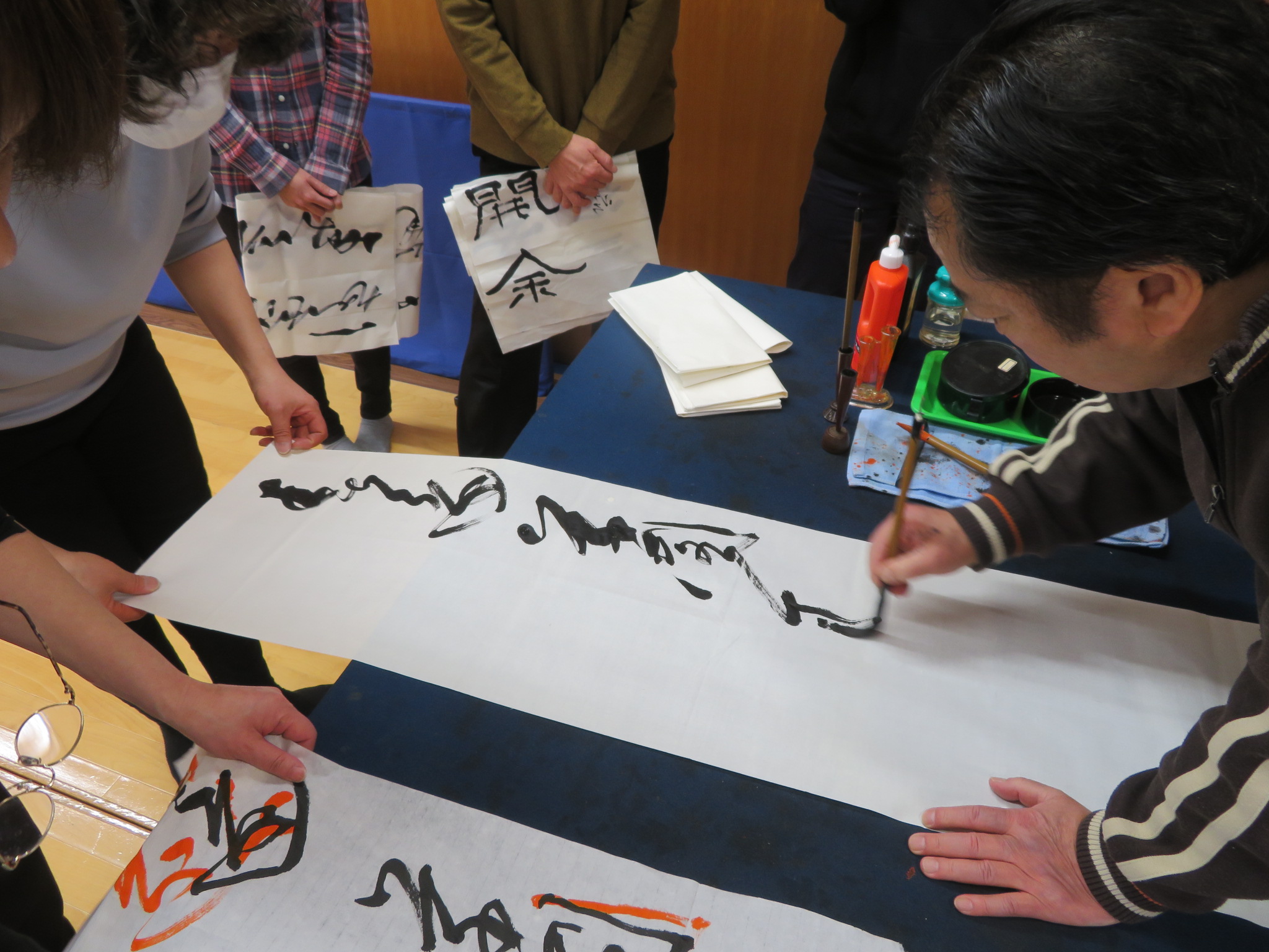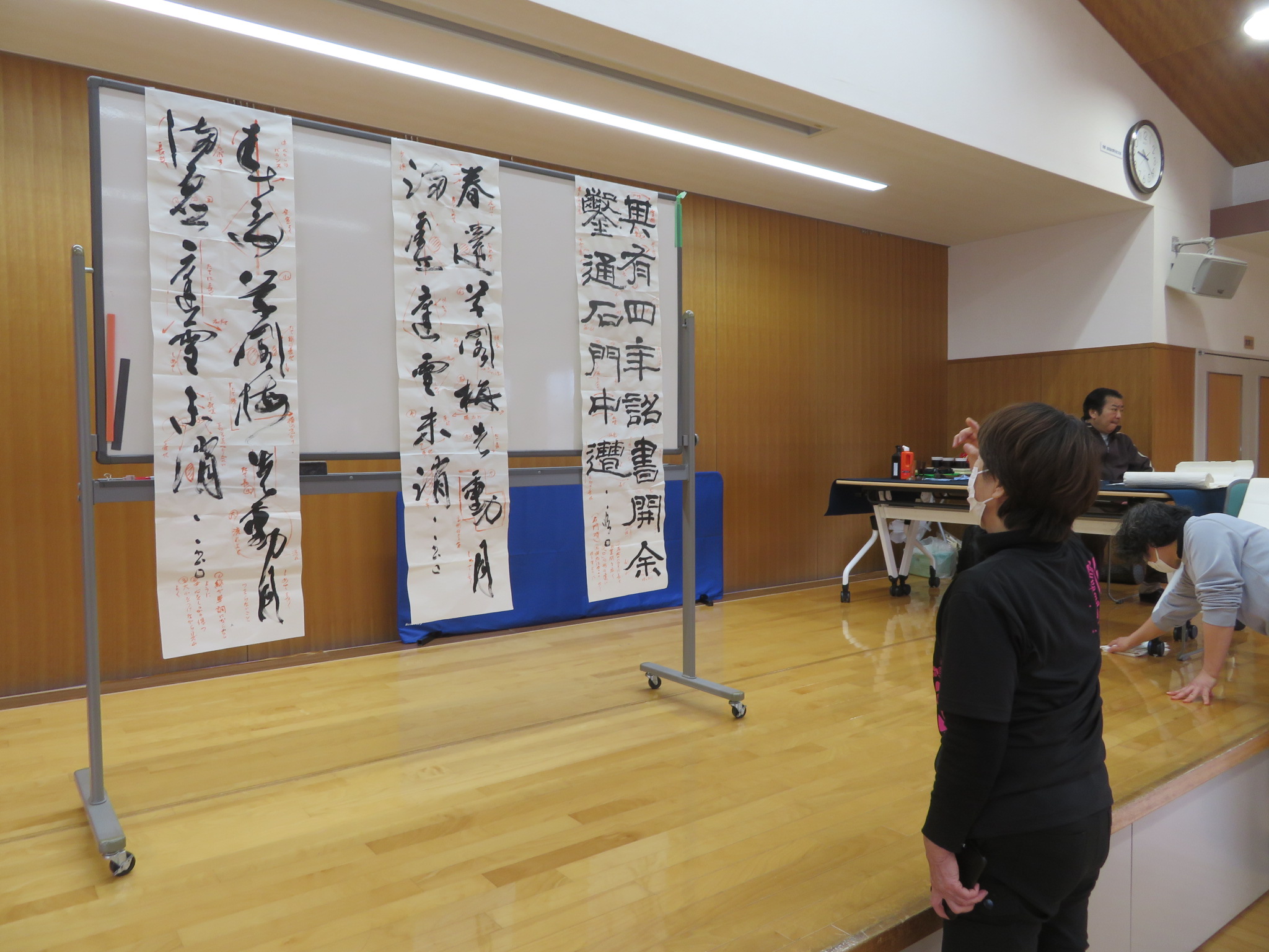 講義では、会長自ら筆を執り、昇段級課題のポイントを具体的に解説。お手本を食い入るように見つめる会員の皆様からは、一画一線を大切にしようとする熱意が伝わってきました。 広い会場で集中して大作に挑む時間は、日頃の稽古とはまた違った刺激となります。お互いの作品から学び、高め合った今回の錬成会。この経験が、皆様のさらなる飛躍につながることを期待しております。